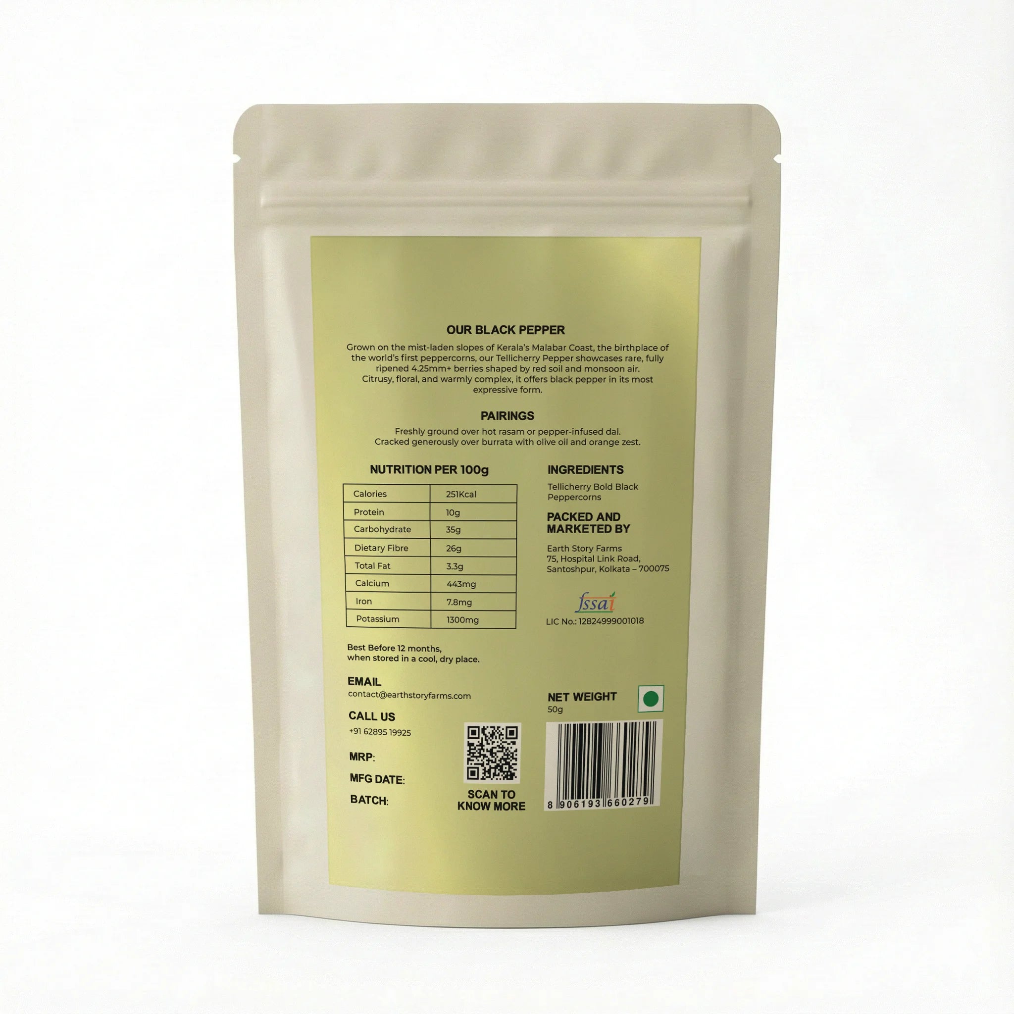Grown on the mist-laden slopes of Kerala’s Malabar Coast, the birthplace of the world’s first peppercorns, our Tellicherry Pepper showcases rare, fully ripened 4.25mm+ berries shaped by red soil and monsoon air.